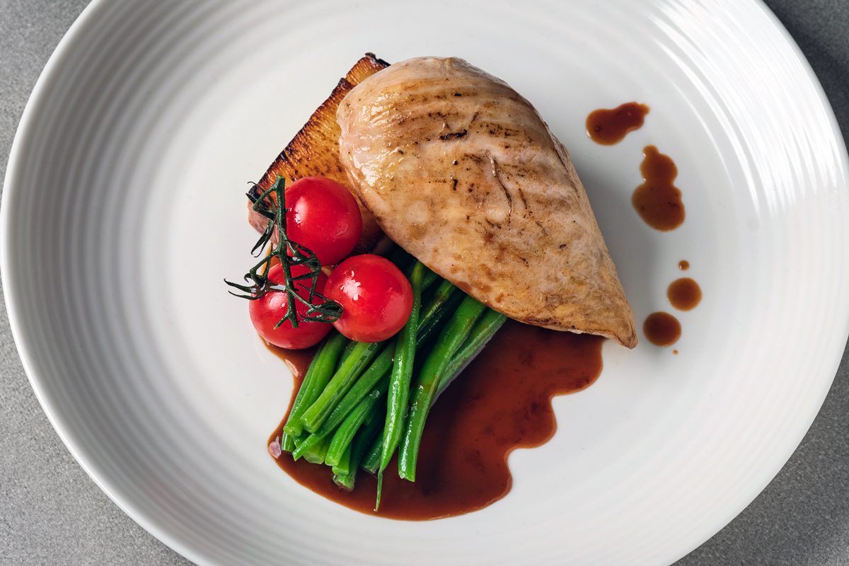 Main – Oven roasted chicken breast, potato pave, Green beans, jus