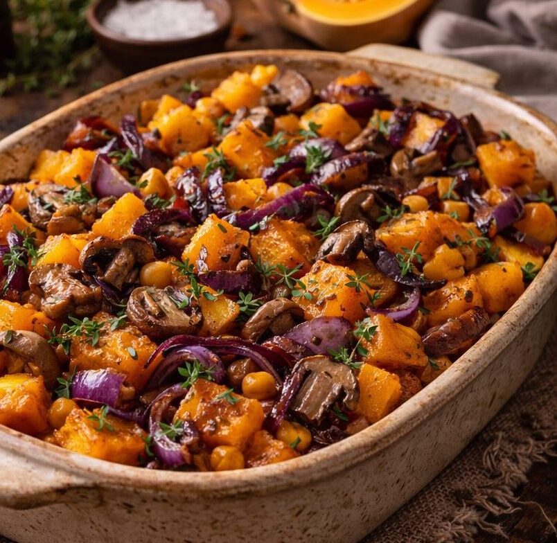 - Mediterranean one-pot stew with roasted butternut squash, peppers, olives, courgettes, oyster and chestnut mushrooms, lentils, sweet smoked paprika and thyme