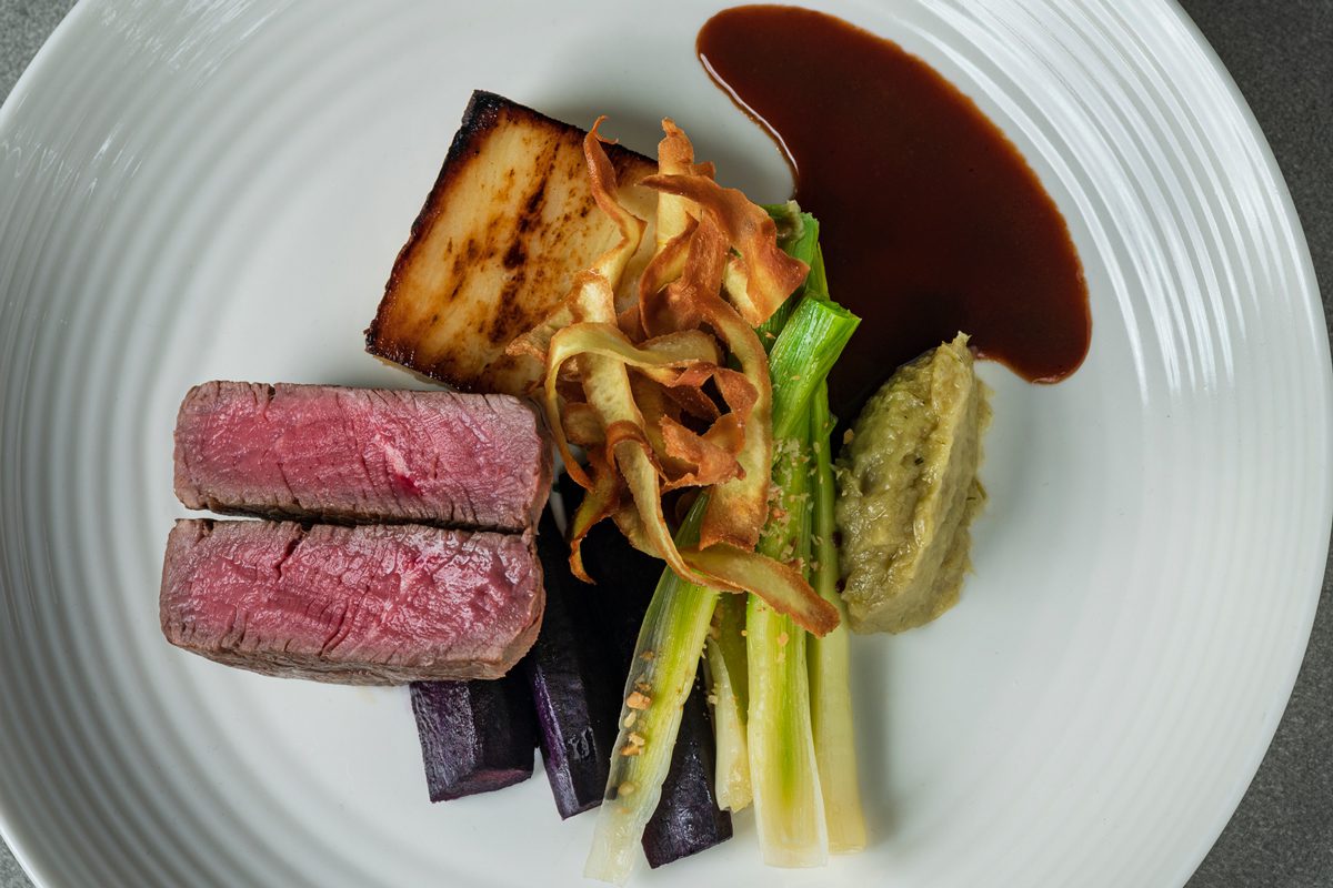 Main – Isle Of wight fillet of beef, potato pave, baby leeks, heritage carrot, toasted hazelnuts, shallot puree, parsnip crisps, porcini jus